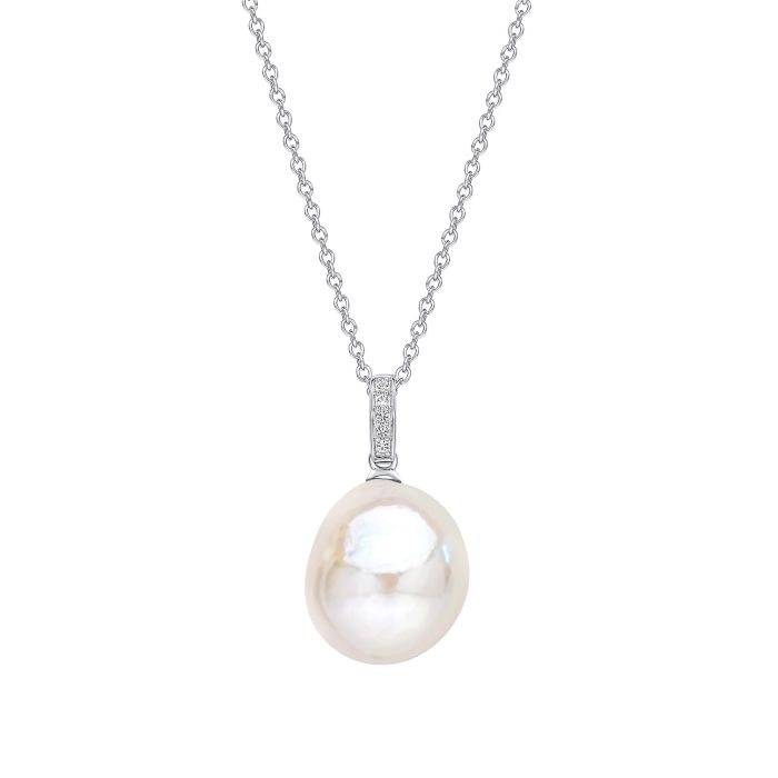 9ct white gold, baroque pearl and white topaz drop pendant. Length: 23mm including bale. 3.5g. (Neckchain sold separately).