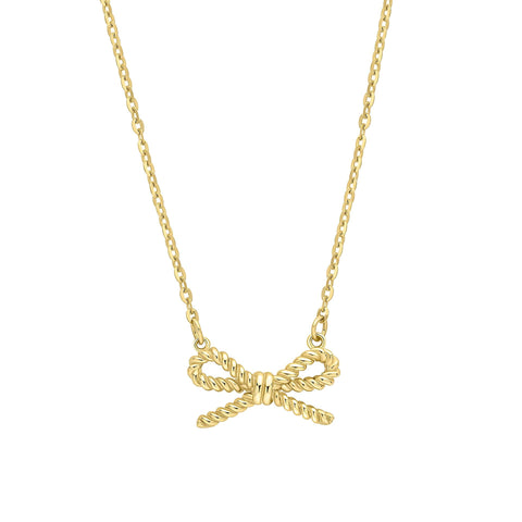 9ct gold rope bow pendant with neckchain. Width: 13mm. Chain: 45cm with adjust at 40cm. 1.5g.